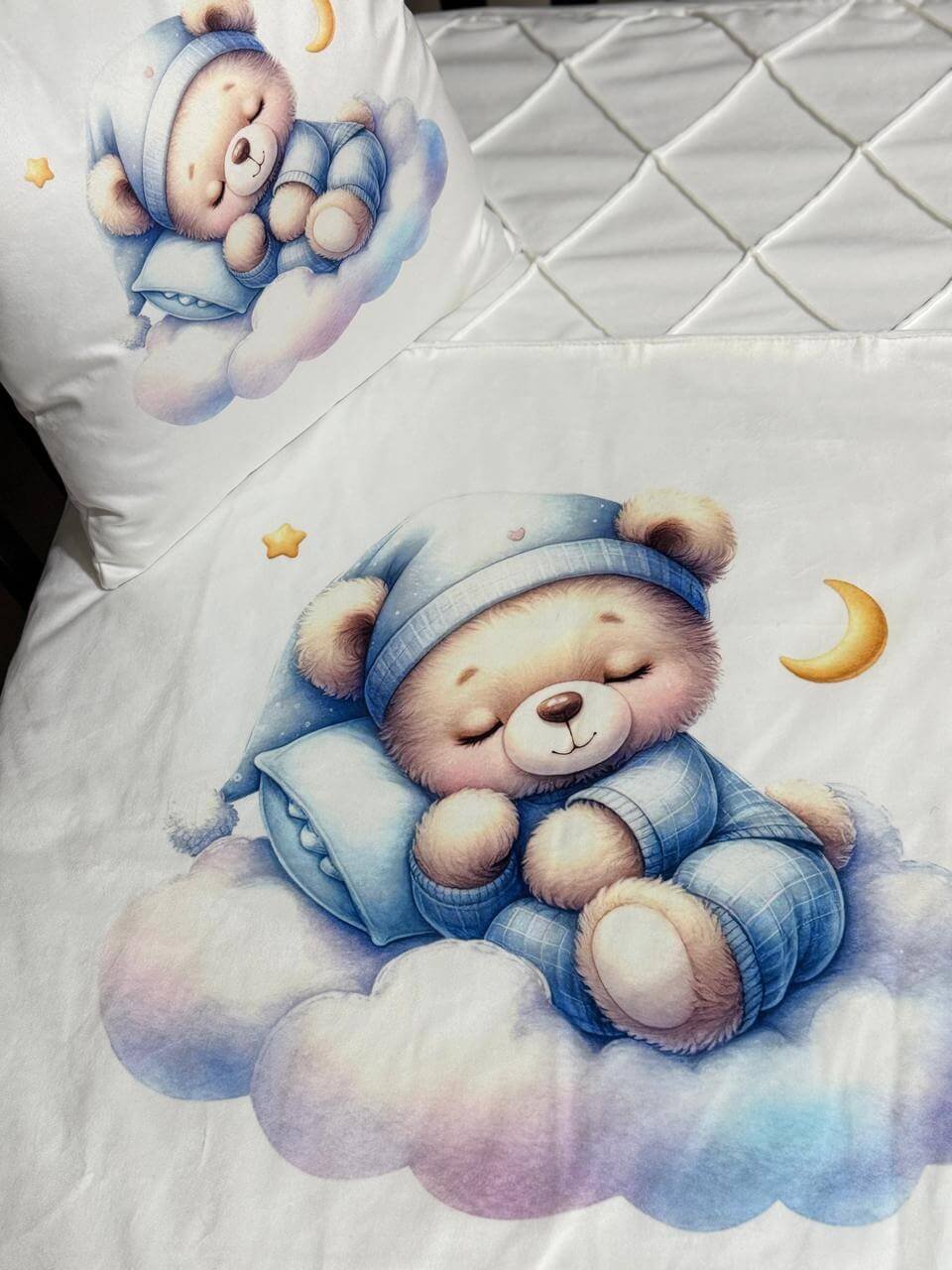 Cobertor de cuna confeccionado en tela suave y resistente, con ilustración de un tierno osito dormido sobre una nube, acompañado de luna y estrellas en tonos delicados.