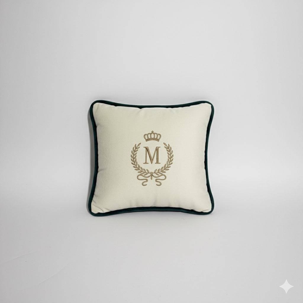 Cojín decorativo en tono beige con ribete negro y bordado central personalizado con inicial y corona.