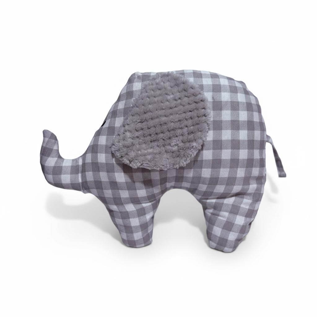 Cojín decorativo en forma de elefante, elaborado en tela de cuadros beige con oreja texturizada de felpa suave.