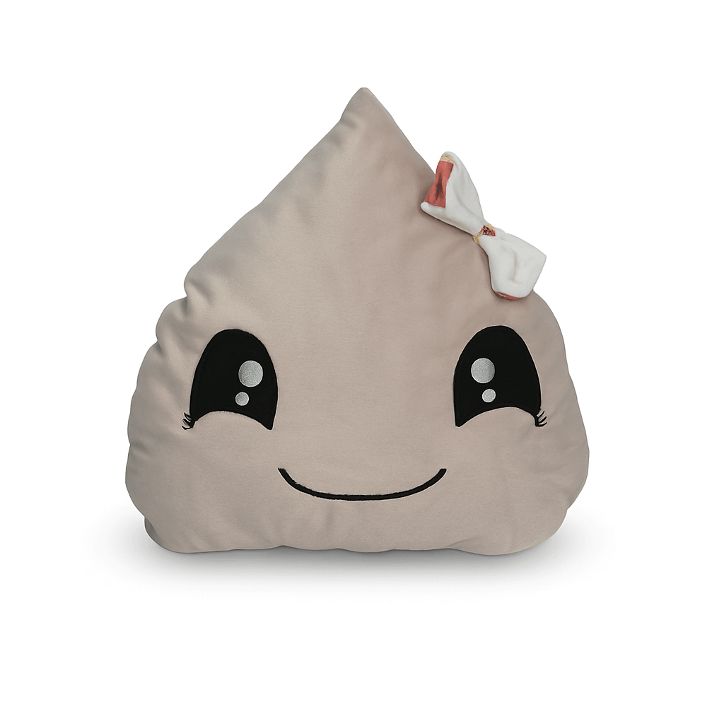 Cojín decorativo en forma de gota con carita bordada y detalle de lazo en tela estampada.