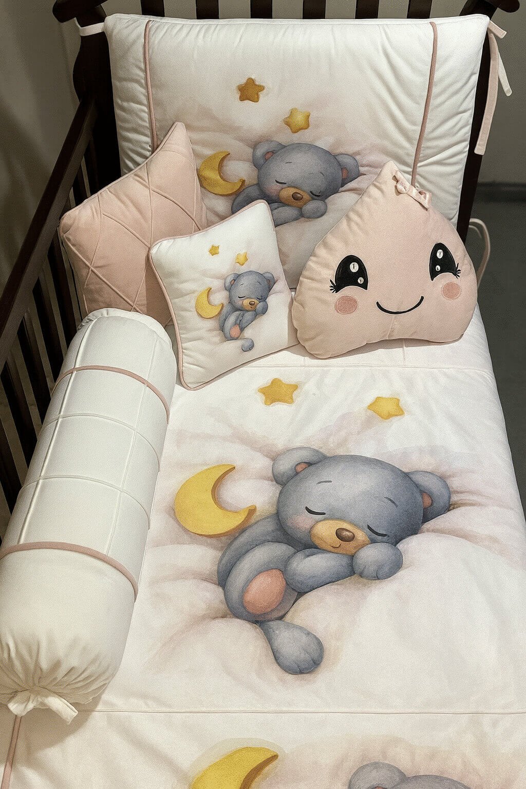 Con un adorable diseño de un osito dormido sobre nubes, acompañado de estrellas y luna en tonos suaves, este menaje transmite serenidad y calidez para el descanso del bebé.