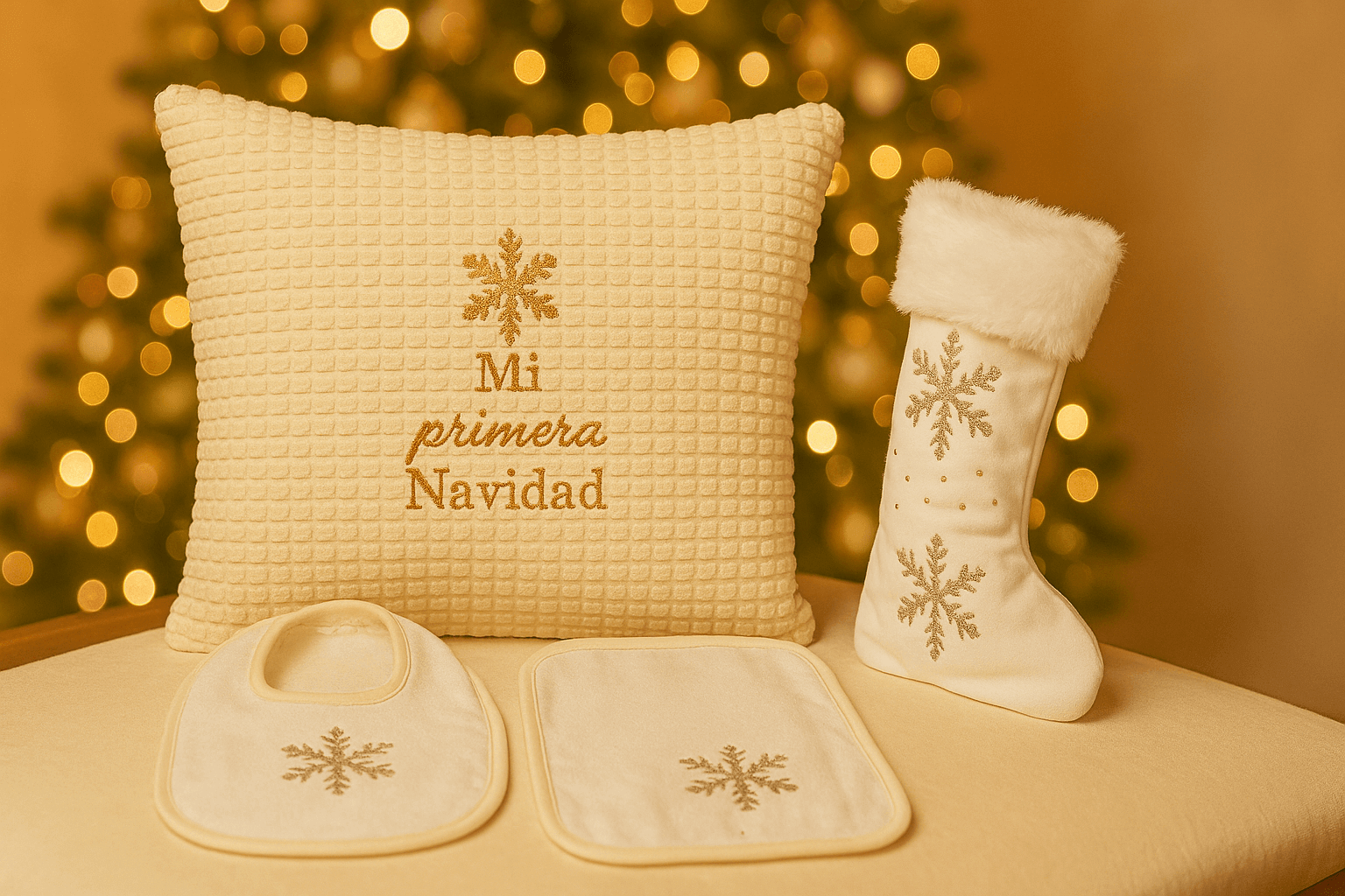 Incluye un cojín bordado con la frase “Mi primera Navidad”, un babero, un paño y una bota decorativa con detalles en hilo dorado y texturas suaves al tacto.
